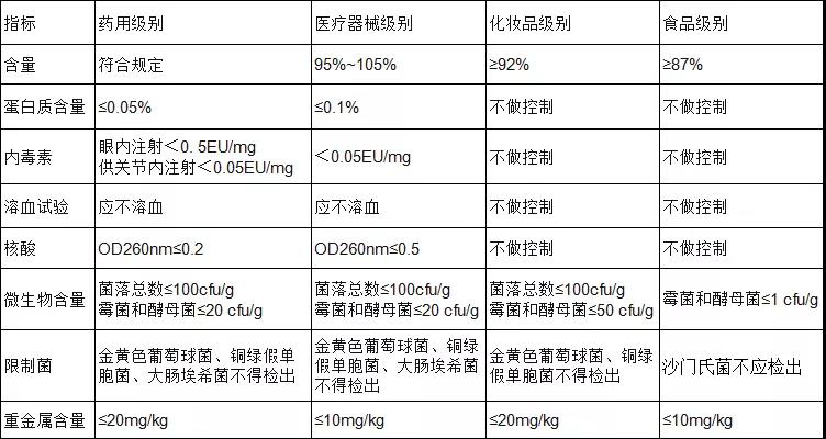 所以透明質酸鈉的級別在管理的法規層面就有明顯的差別。在此,小編從標準的角度對不同的產品的原料質量要求進行了匯總比較,具體數據見如下表格:
