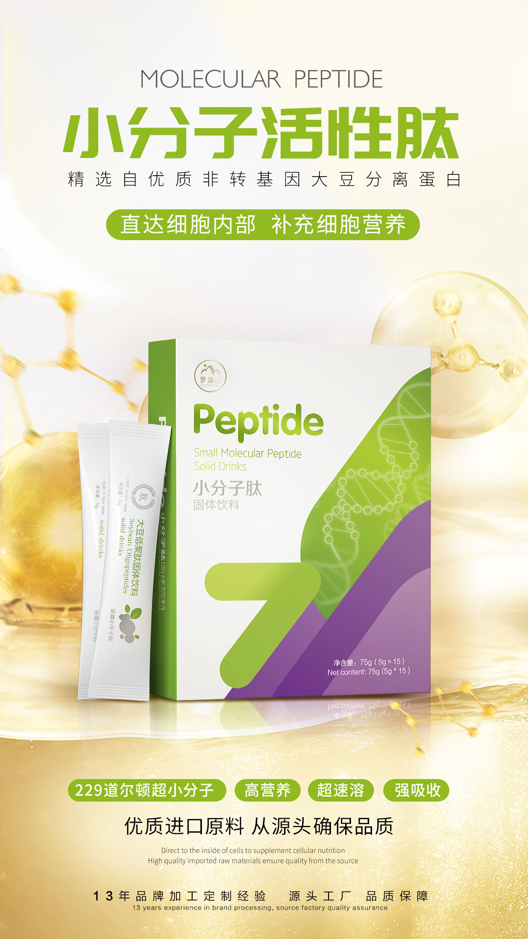 羅湖山生物特推出小分子肽固體飲料,進口原料,229道爾頓超小分子量,超快速吸收,高效轉化,超低能耗,甄選原料,脫色脫味,吃進嘴里的產品,必須有要求!