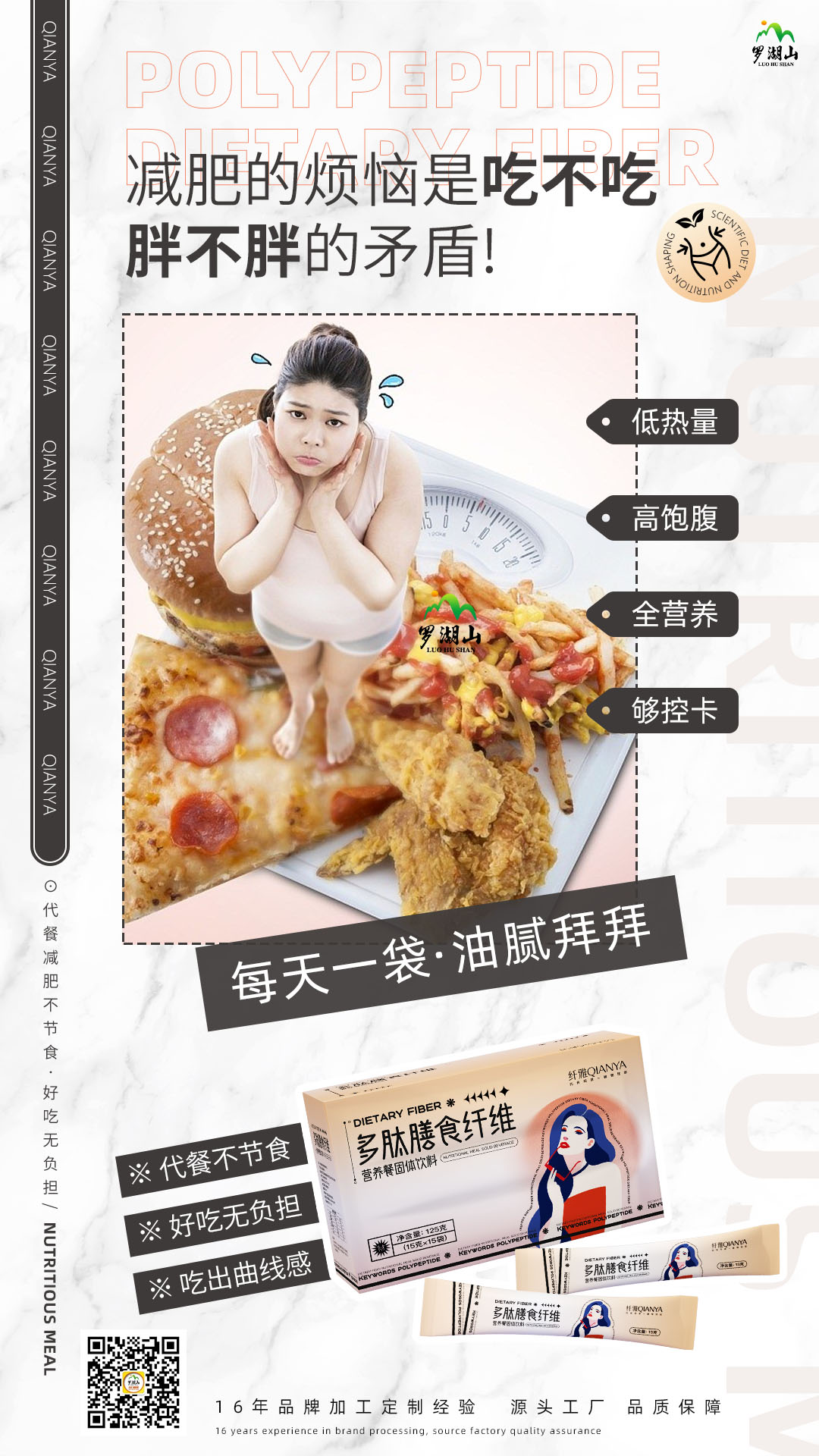 廣州羅湖山生物醫藥科技有限公司特推出多肽膳食纖維營養餐,富含膳食纖維,添加多種小分子肽,高營養,低熱量,強飽腹。