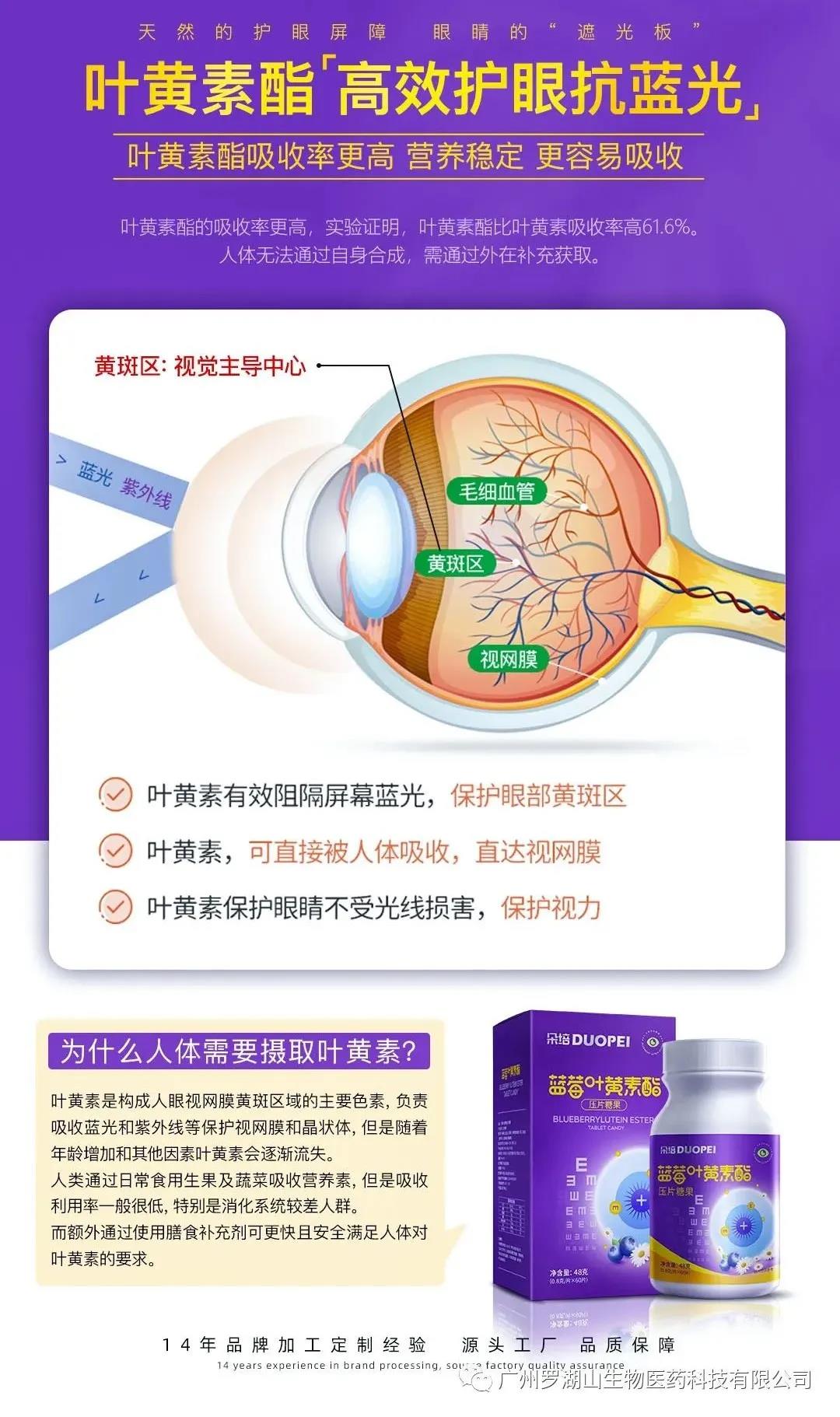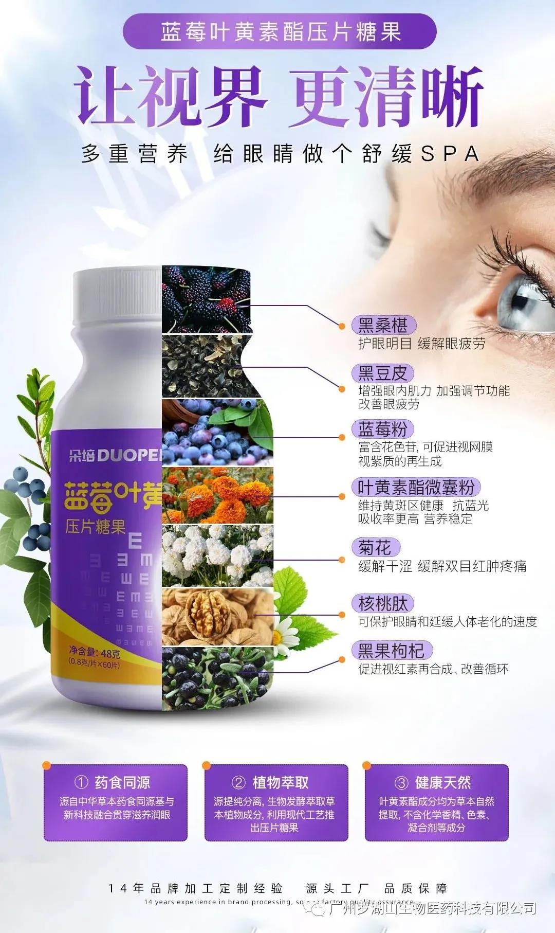羅湖山生物特推出藍莓葉黃素酯壓片,根據各類人群用眼習慣對視覺生理的影響,精選優質藍莓和萬壽菊,運用現代領先工藝提取藍莓粉、葉黃素酯、低聚果糖等物質科學比配,不添加化學合成色素、防腐劑。